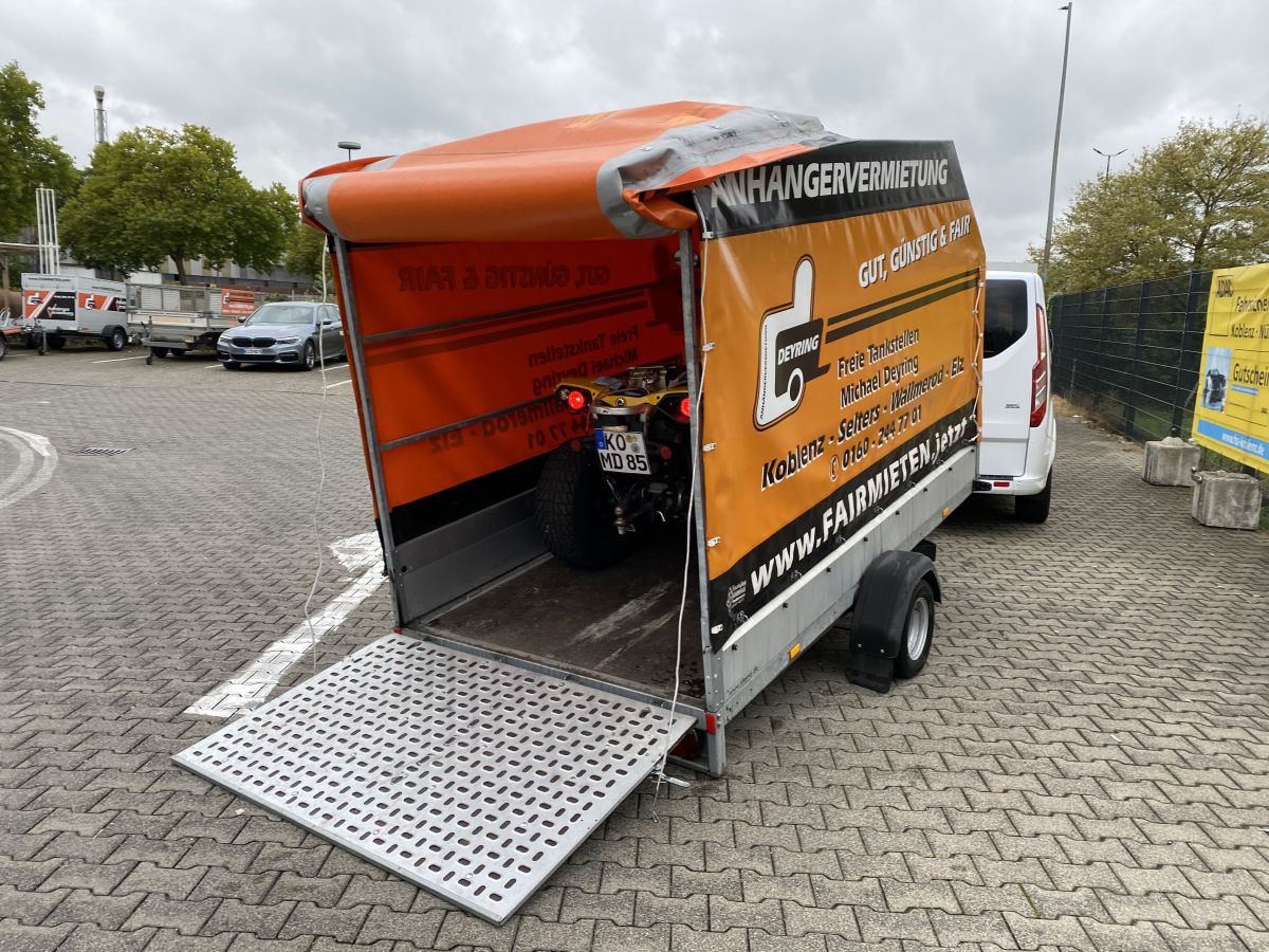 Falls die beplante Variante nicht verfügbar ist, so weichen wir auf den Einachser Koffer 3m aus. Sollte dies der Fall sein, dann informieren wir Sie darüber.