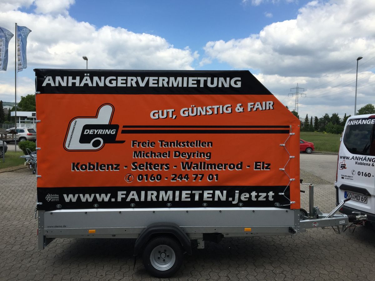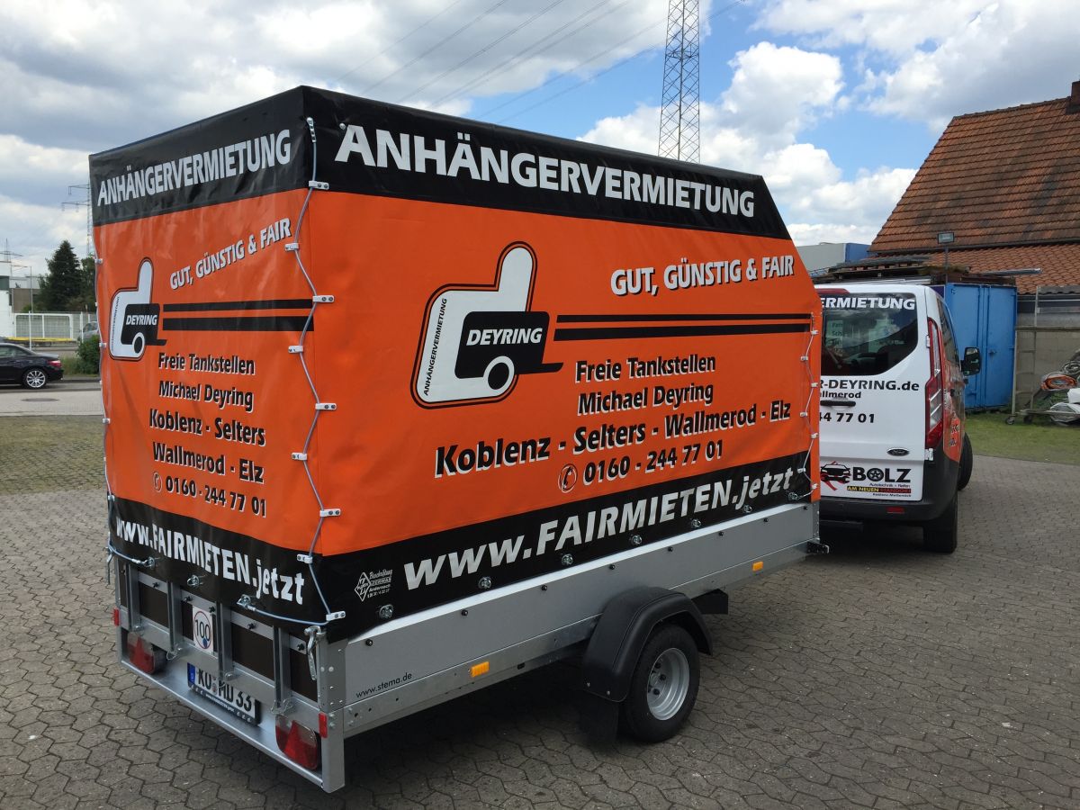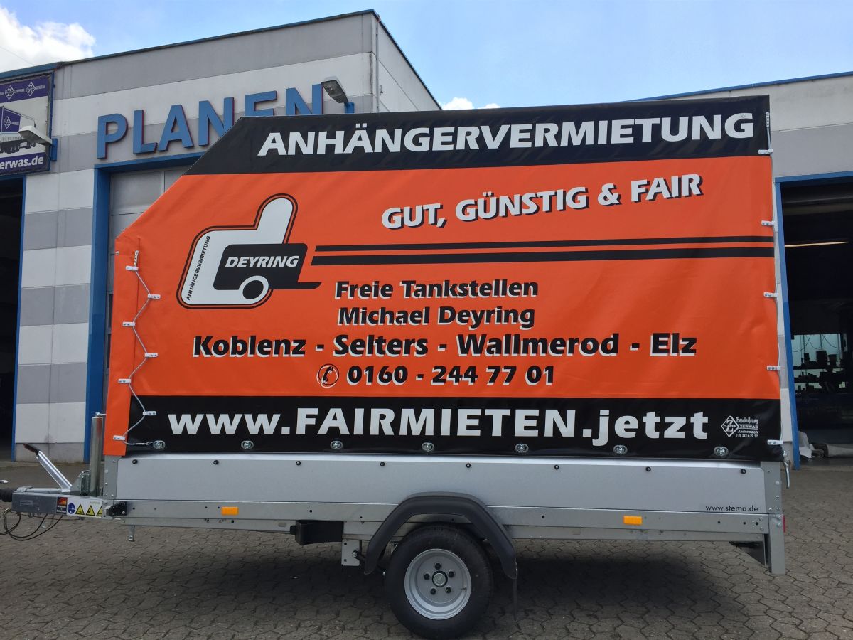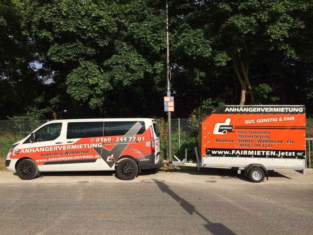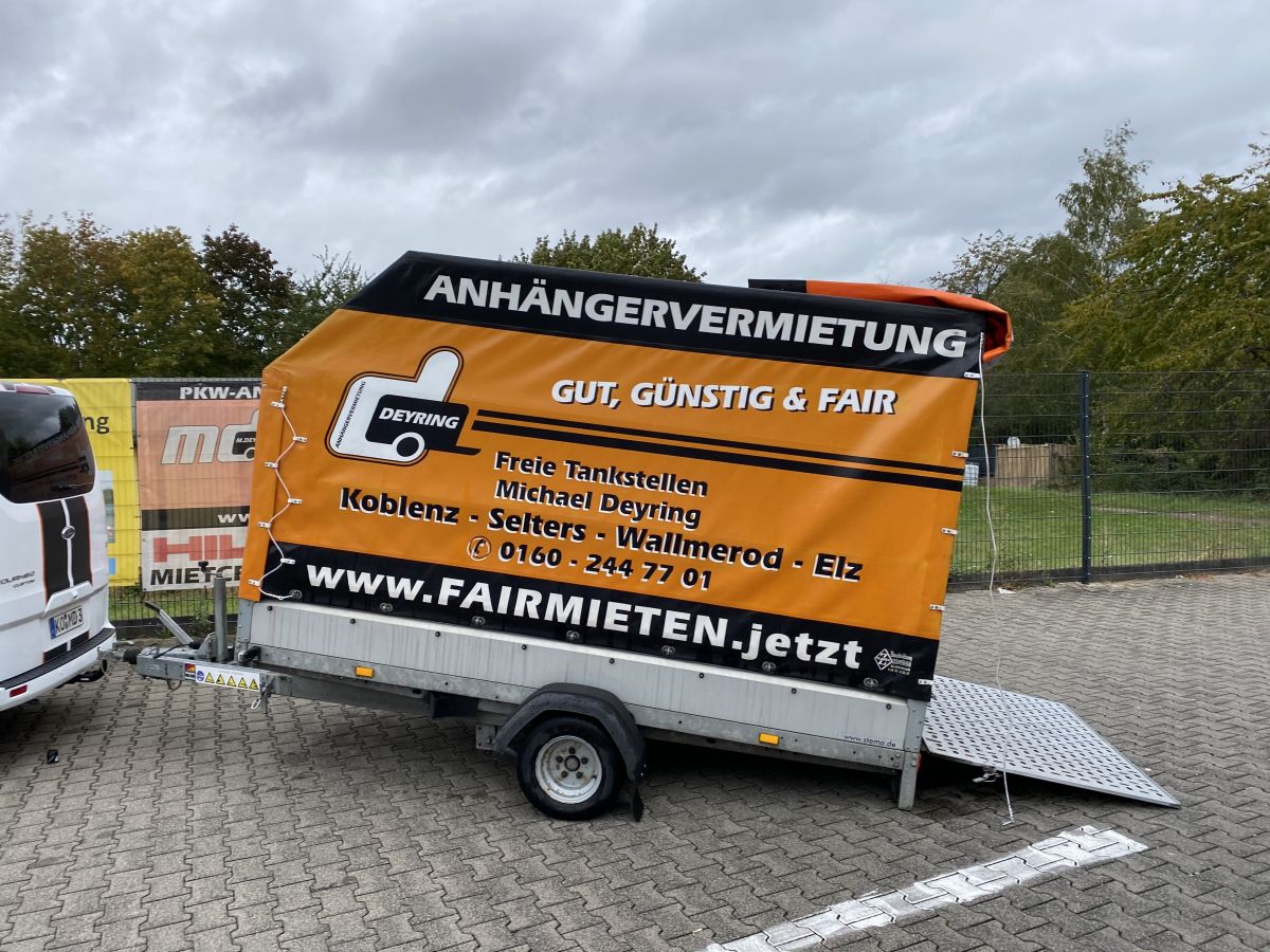 Falls die beplante Variante nicht verfügbar ist, so weichen wir auf den Einachser Koffer 3m aus. Sollte dies der Fall sein, dann informieren wir Sie darüber.